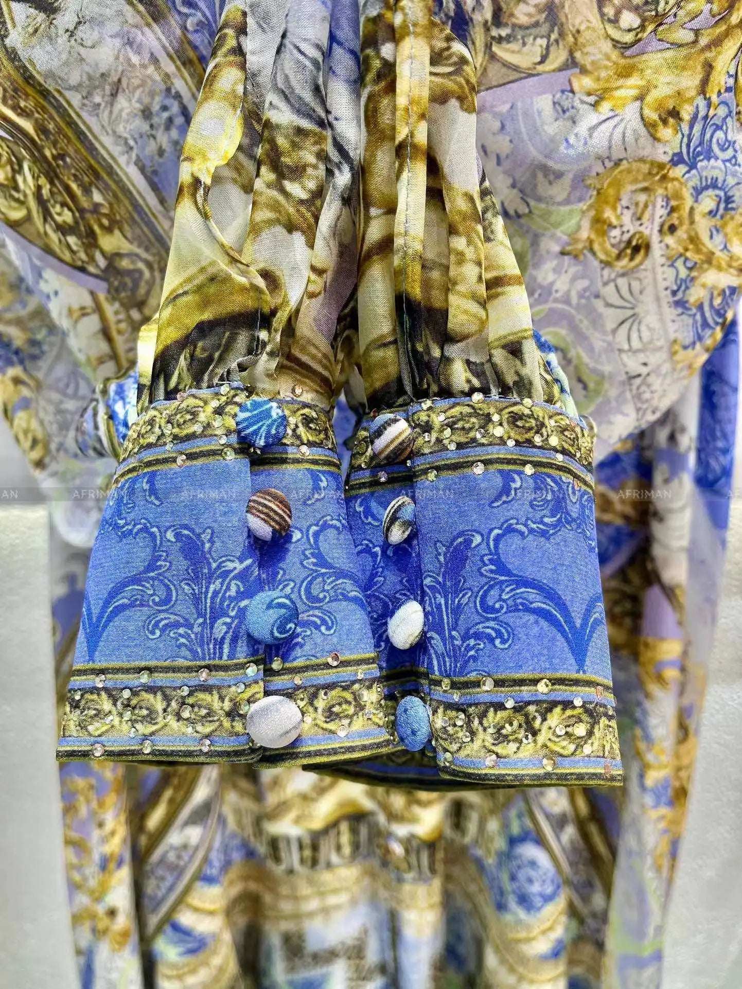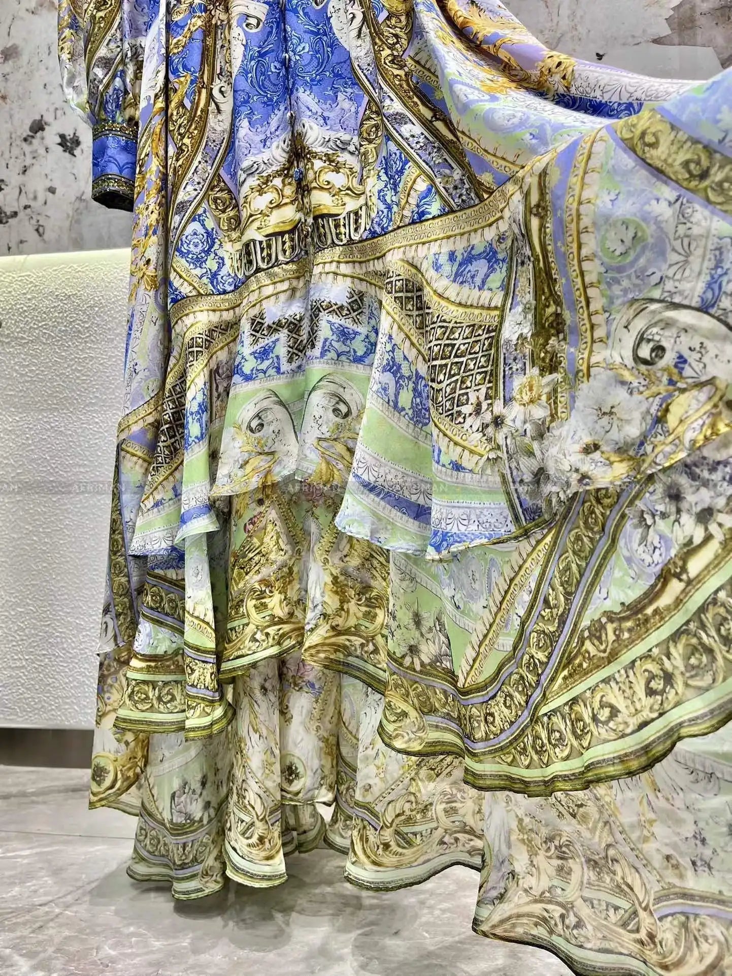 This exquisite designer dress is the epitome of timeless elegance, blending vintage charm with luxurious silk fabric. Designed with a non-stretch fit for a polished look, the dress features a classic A-line silhouette that flatters the figure while offering ease of movement. The V-neckline is adorned with delicate beading, adding a touch of sophistication to the vibrant printed pattern.