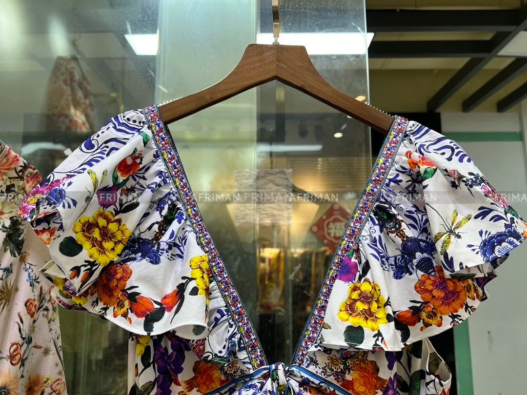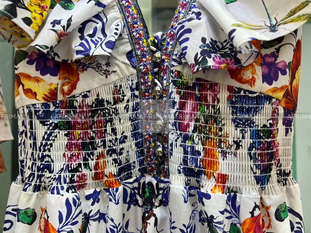 This exquisite designer dress beautifully blends vintage style with modern comfort, making it a timeless addition to any wardrobe. Crafted from a luxurious cotton and linen blend with slight stretch, the dress offers a comfortable yet elegant fit. The V-neckline, adorned with delicate beading, adds a touch of sophistication, while the flying sleeves bring a playful and graceful element to the design.